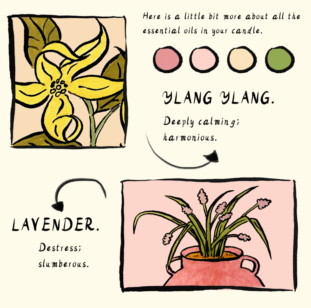 Ylang Ylang Essential Oil; Lavender Essential Oil; Marjoram Essential Oil; Bergamot Essential Oil; Pure Soy Wax; Cotton Wick.